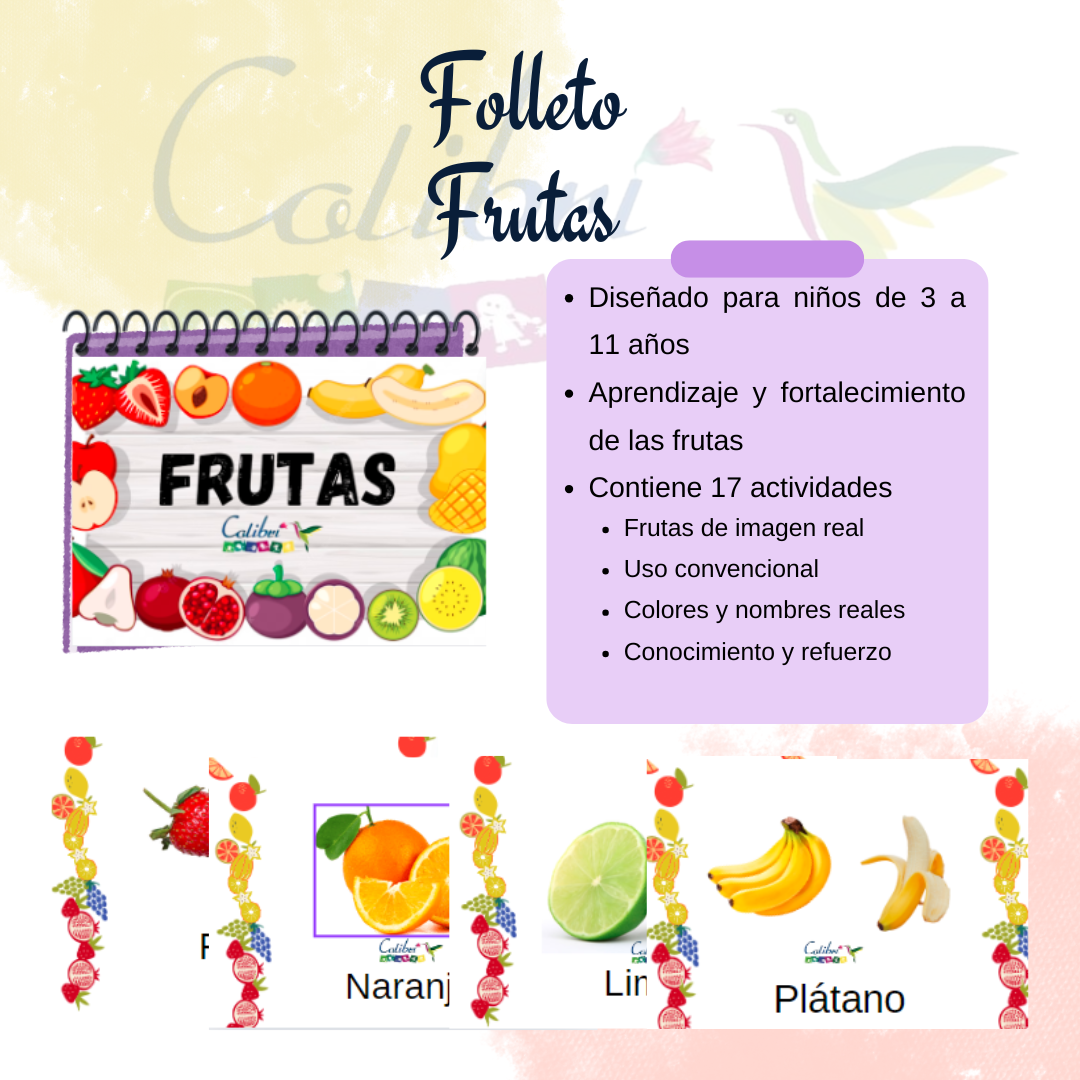 Folleto contiene imágenes con nombres de frutas de uso común