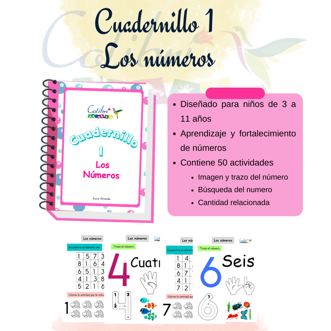 Cuadernillo contiene actividades para trabajar los números del 1 al 10 reforzando numero, trazo, cantidad y relación en la mano.